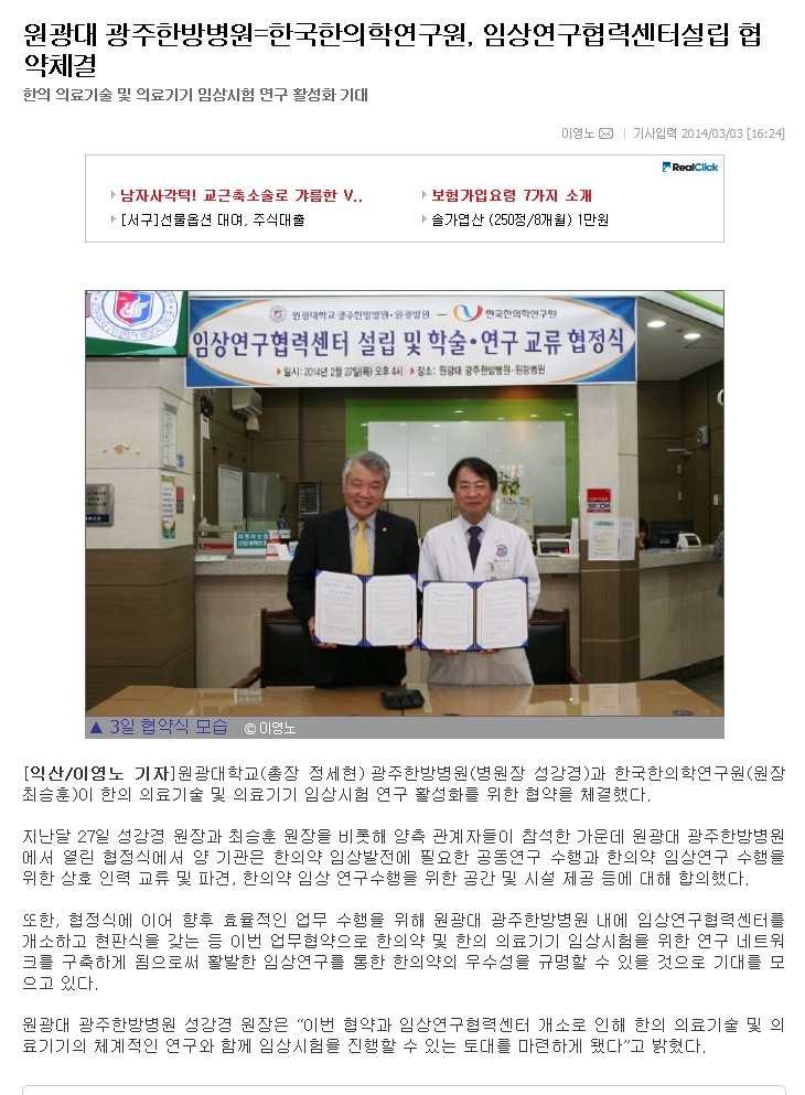 원광대 광주한방병원=한국한의학연구원, 임상연구협력센터설립 협약체결