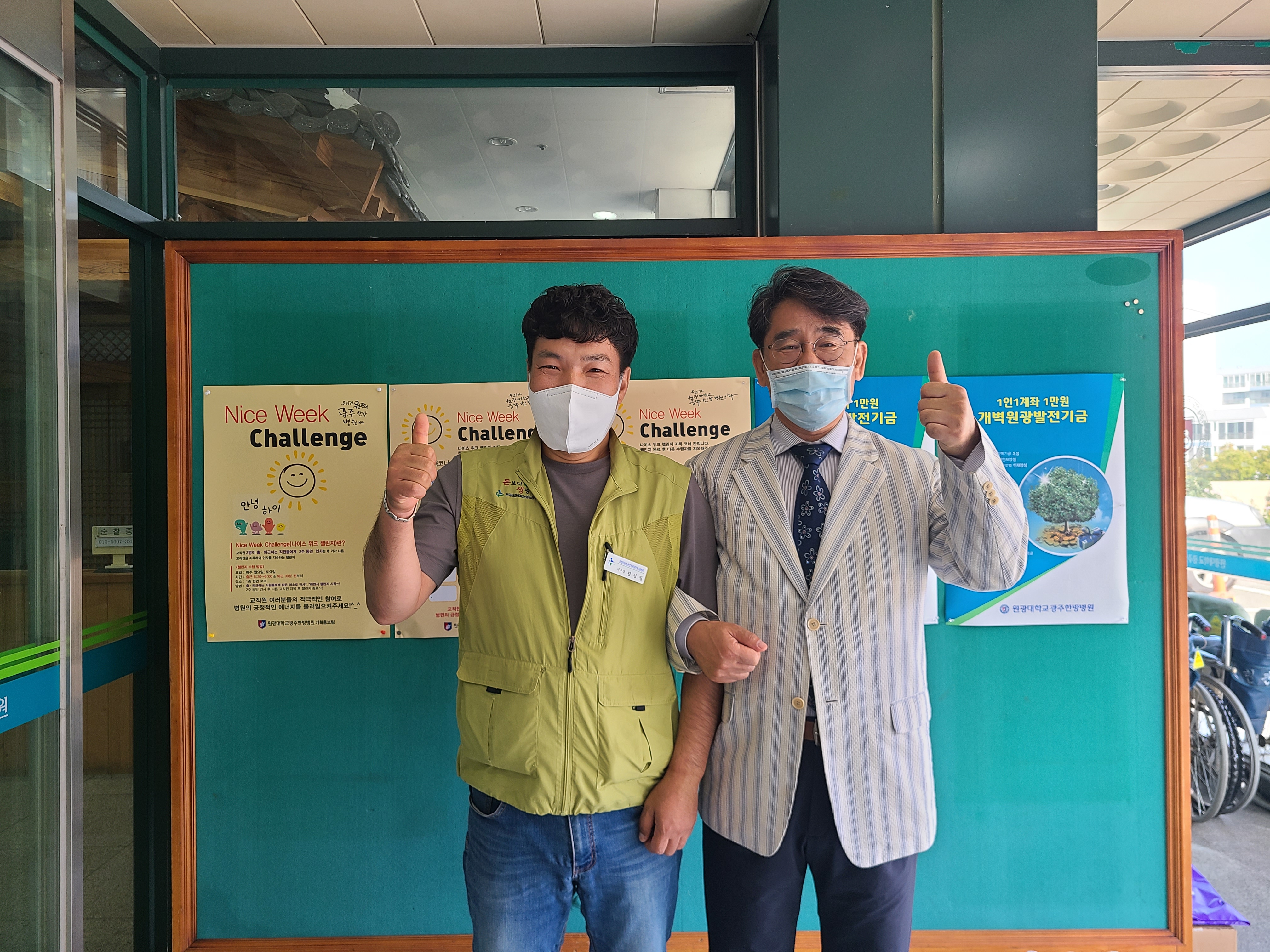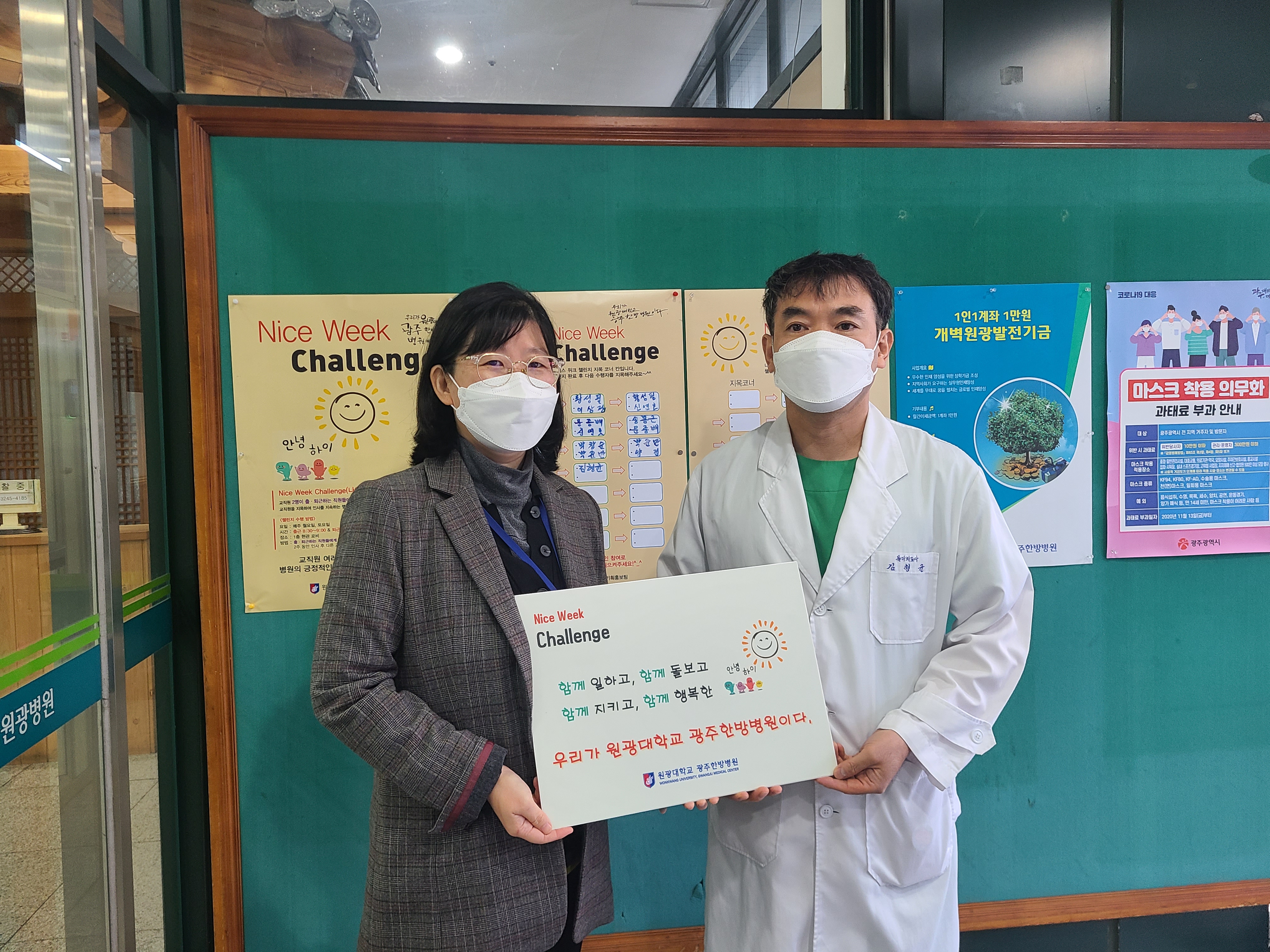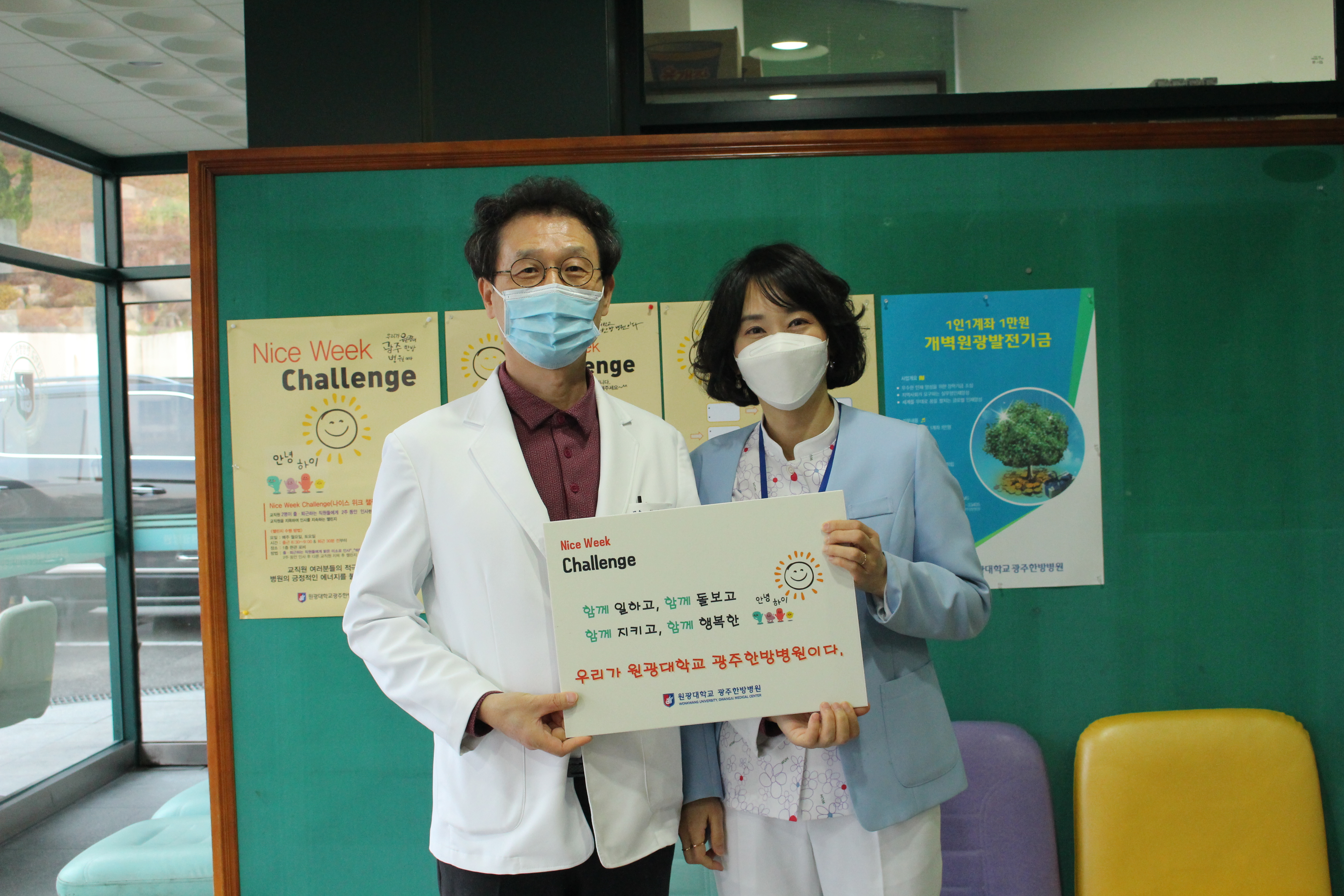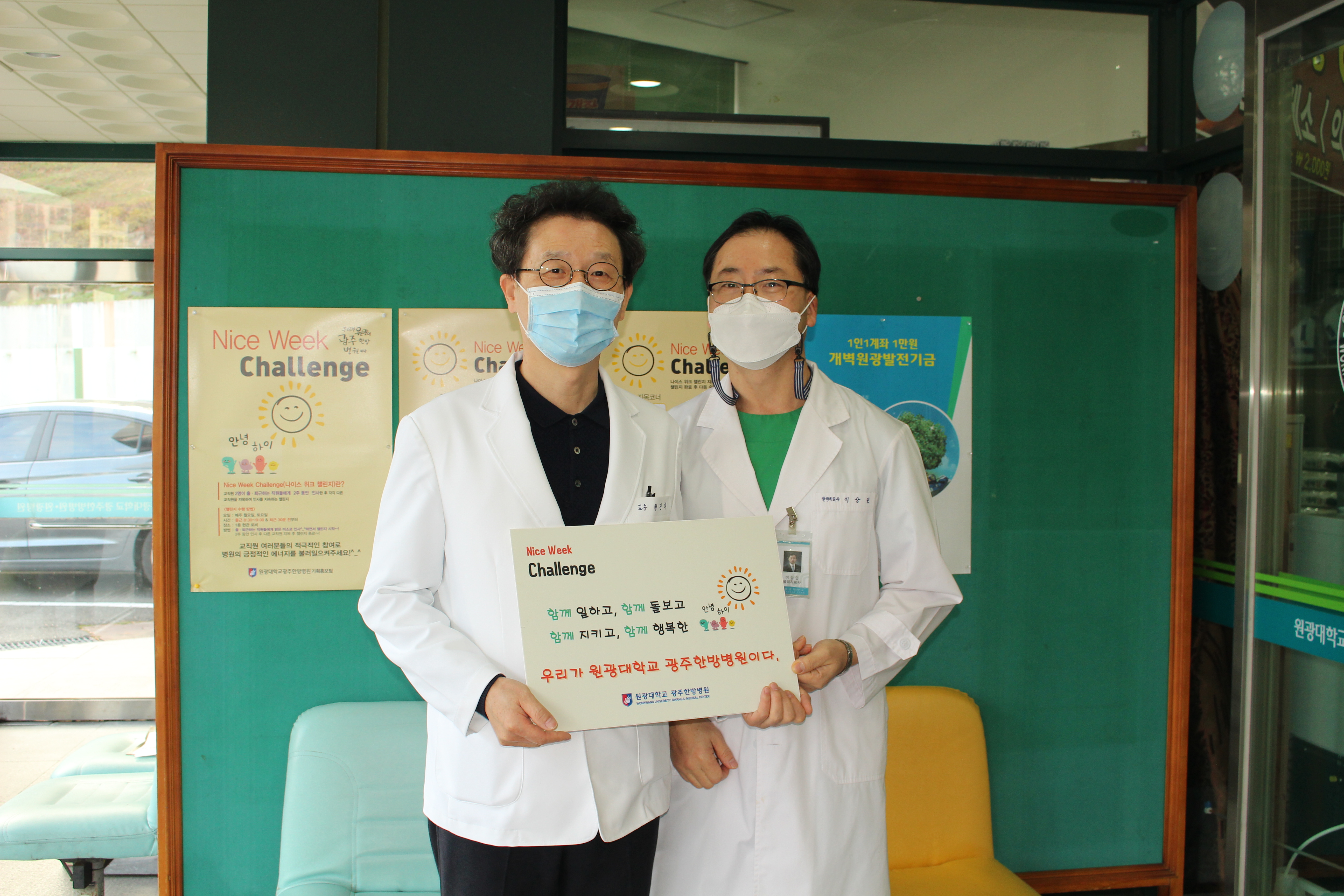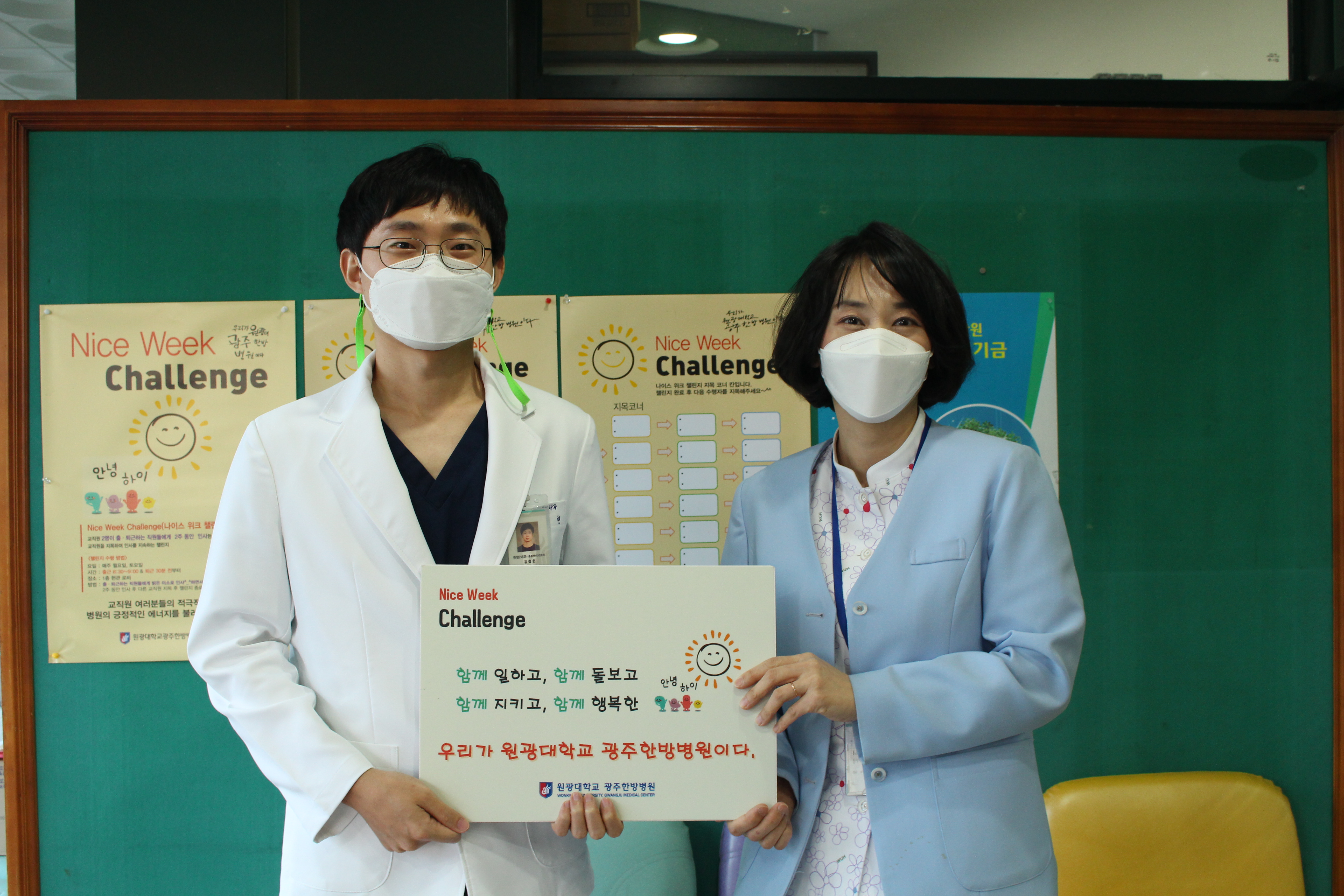 우리 병원에서는 교직원 선생님들과의 화합과 활기찬 한 주를 위해 Nice Week Challenge 를 시행하고 있습니다.한 주의 시작인 월요일과 한 주의 끝인 토요일 출,퇴근 시 서로의 인사를 통해 기분 좋은 한 주의 시작과 끝을 행복하게 지내고 있습니다.